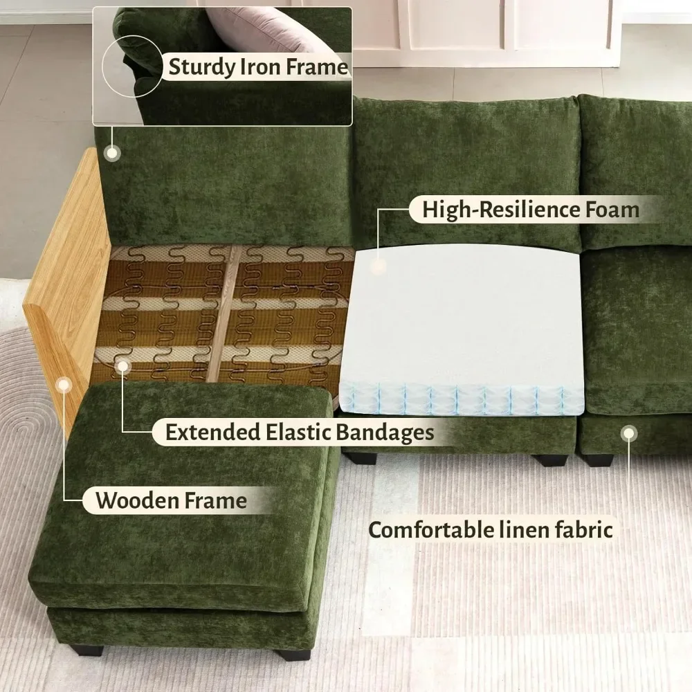 - Sturdy Construction: This modular sectional sofa features an iron frame for the backrest and a wooden frame for the seating area, ensuring a solid and reliable structure. Each seat supports up to 300 pounds, offering strong load-bearing capacity and long-lasting use—ideal for daily family activities